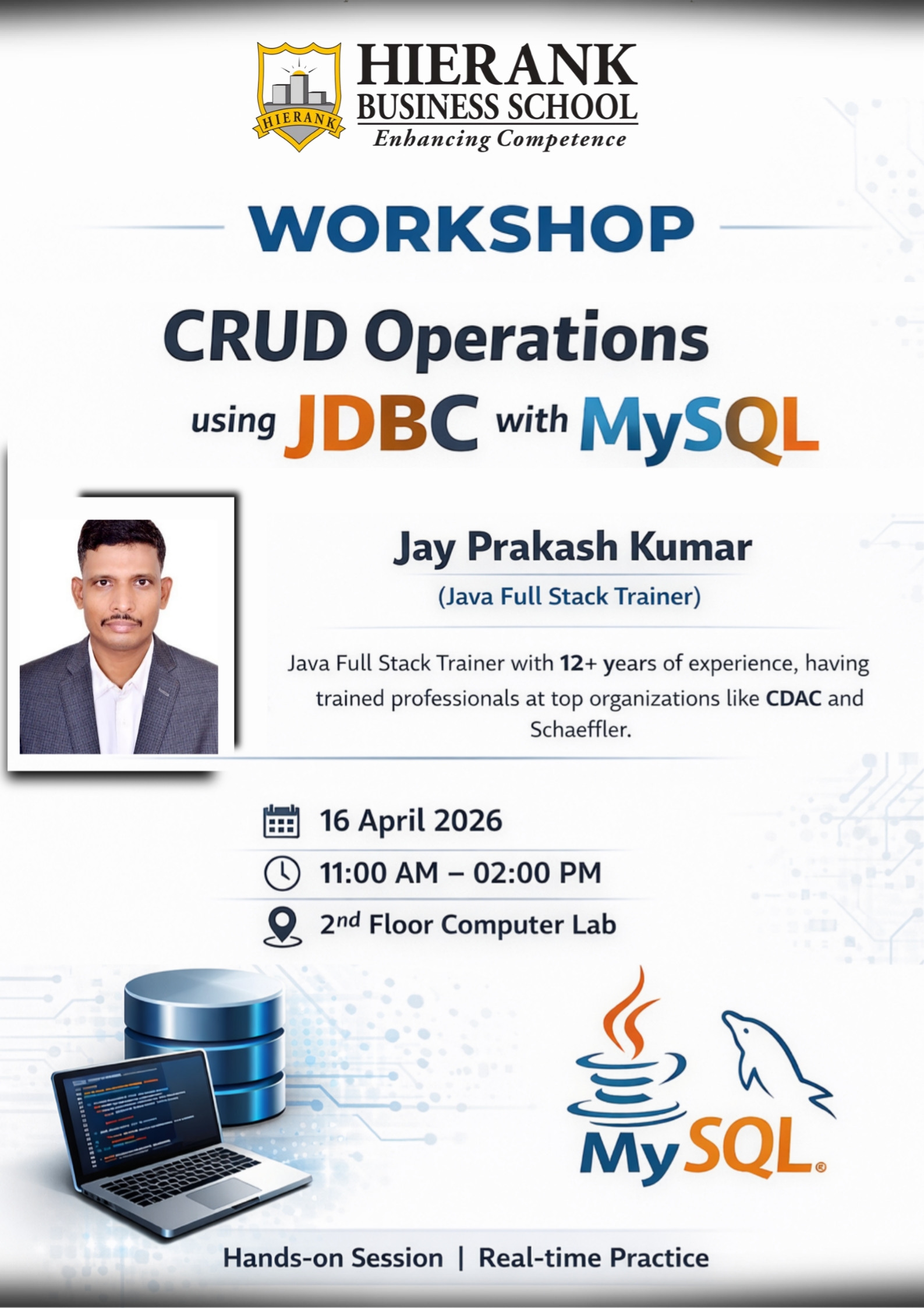 Hierank Business School successfully conducted a hands-on workshop on CRUD Operations using JDBC with MySQL on 16 April 2026, led by industry expert Jay Prakash Kumar, providing students with practical exposure to real-time database operations.